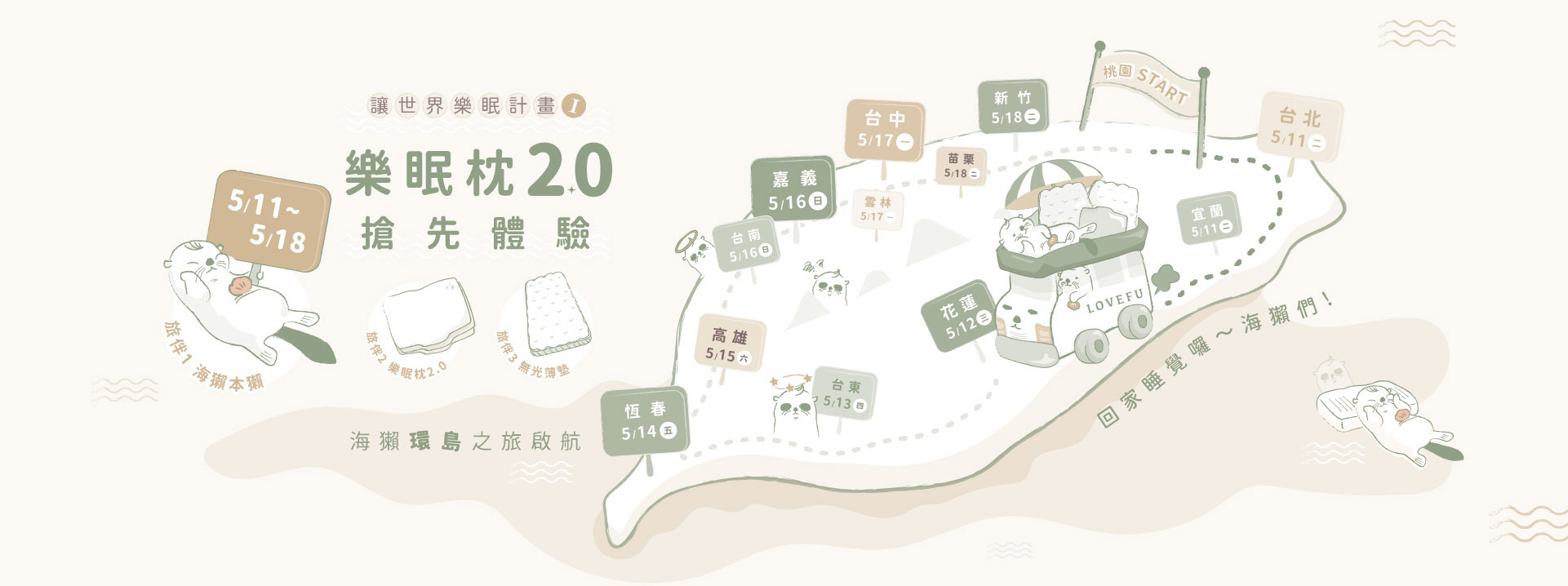 還記得4月的最後一個禮拜,我釋出辦公室海獺夥伴們認真討論的照片,非常開心地與大家說「5月!5月我們將帶來一個又驚又喜的活動」是的,就是桂格提到的「環島」!為了各地長期敲碗並引頸期盼試躺會的海獺們,準備帶著我們的小新星-樂眠枕2.0,開著樂眠專車環台一圈 搶先讓大家體驗。