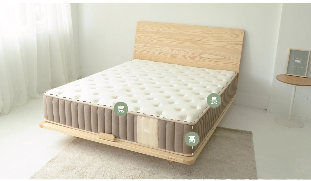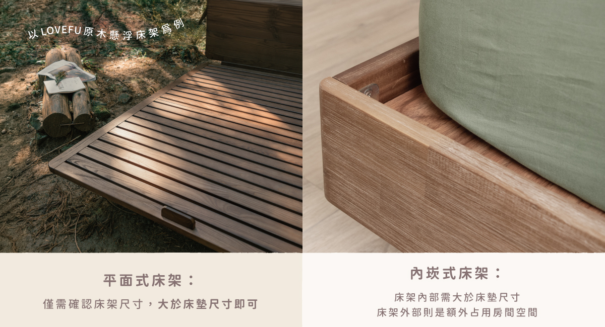 以平面式的LOVEFU原木懸浮床架為例,因無外框限制,可以直接依據床墊尺寸,進而選擇床架尺寸。