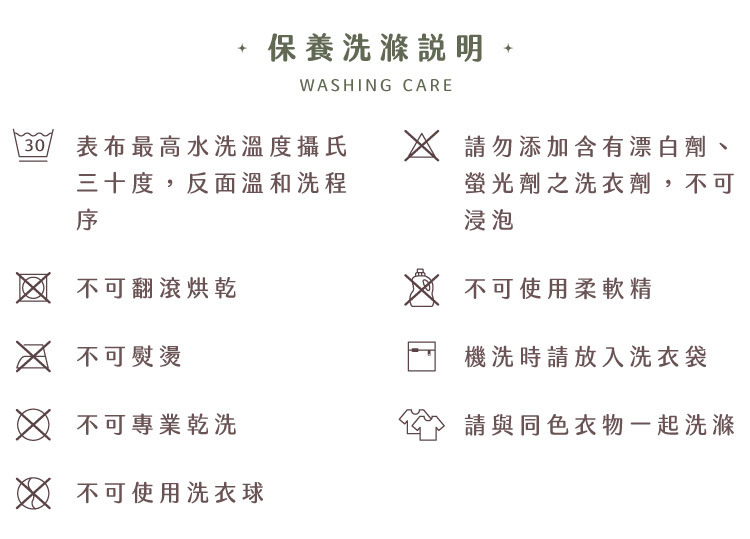 ˙ 本商品可於陰涼處晾乾,但不可太陽高溫曝曬。