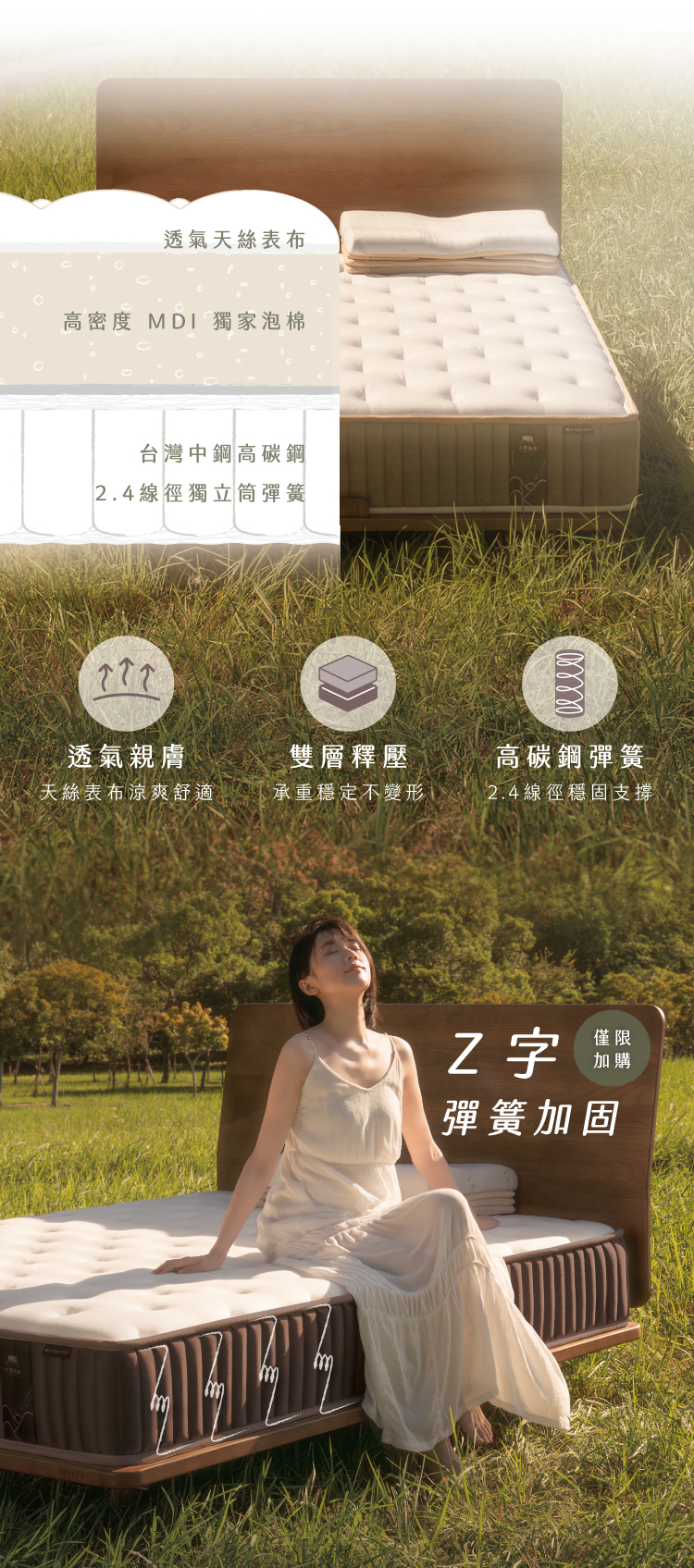 我們使用的是2.4mm 高碳鋼獨立筒彈簧,屬於市面上偏粗的規格。這樣的設計特別適合喜歡有撐托感、不會陷太深的人。